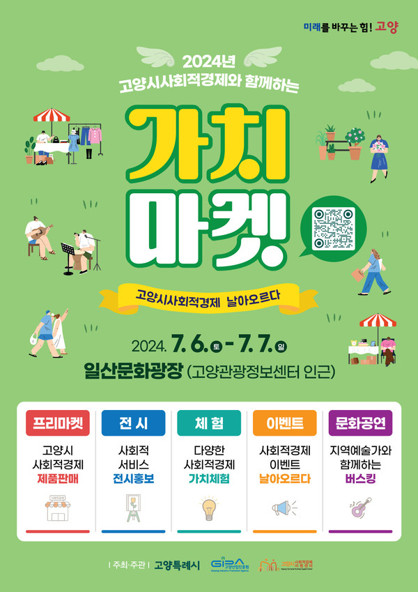 [고양신문] 고양시가 사회적경제 생태계 육성을 목표로 2024년 '가치마켓'을 일산문화광장 고양관광정보센터 인근에서 운영한다. 올해는 두 차례 열릴 예정이며, 1차 행사는 사회적경제 주간을 맞아 7월 6일(토)과 7일(일) 이틀간 진행되며, 2차 행사는 10월 5일(토), 6일(일) 진행될 예정이다.