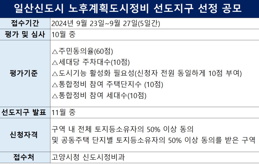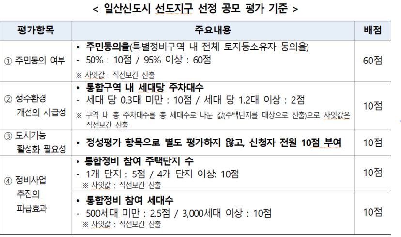 시 관계자는 “시는 지난달 국토부에서 발표한 1기 신도시 선도지구 선정계획에 따라 일산신도시 지역 여건을 반영하고 주민 의견을 종합적으로 검토해 세부 배점 기준을 확정했다”고 밝혔다.