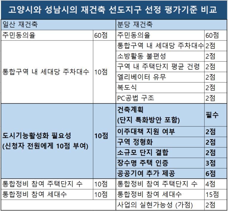 [고양신문] 공원녹지, 학교, 주차장 확보 등 도시기능 활성화 노력이 고양시의 재건축 선도지구 선정에는 아무런 영향을 미치지 못하게 된다. 25일 고양시가 발표한 선도지구 선정을 위한 평가기준에는 ‘도시기능 활성화 필요성’이라는 항목이 있지만, 시는 별도로 평가하지 않고 신청자 전원에게 동일하게 10점을 부여하기로 했다. 사실상 ‘도시기능 활성화 필요성’이라는 평가항목은 있으나마나한 항목이 됐다.