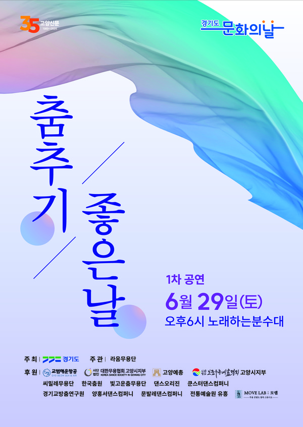 [고양신문] 문화의 날을 맞이해 라움무용단이 고양무용협회 후원으로 오는 29일(토) 오후 6시 일산호수공원 노래하는 분수대에서 '춤추기 좋은 날'을 관객들에게 선사한다. 경기도가 주최하고 라움무용단이 주관하는 이번 공연은 지금까지 경험하지 못했던 새로운 춤의 진수를 보여줄 예정이다.