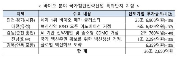 정부는 공고 기간 동안 고양을 비롯해 인천, 수원, 성남, 시흥 등 수도권 5곳과 강원, 대전, 충북, 경북, 전남, 전북 등 비수도권 6곳으로 총 11개 지역의 신청을 받았다. 11개 지역에 대해 선도 기업의 투자 규모, 산업 생태계 발전 가능성, 지역균형발전 등을 고려해 평가한 결과 5곳을 바이오 특화단지로 지정했다고 설명했다. 정부는 이들 5개 국가첨단전략산업 단지에서 선도 기업들이 2040년까지 36조3000억원을 투자할 것으로 보고 있다.