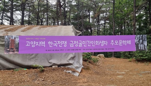 [고양신문] 한국전쟁 당시 고양에서 벌어진 비극적인 역사를 기억하기 위한 ‘2024 고양지역 한국전쟁 금정굴민간인희생자 추모문학제(이하 추모문학제’)’가 지난 29일 일산서구 황룡산 기슭 금정굴 현장에서 열렸다. 고양작가회의(회장 문창길 시인)가 주최하고 경기작가회의가 후원한 이날 행사는 ▲금정굴 탐방 ▲금정굴 주제 작품낭독회 ▲문화공연 순으로 진행됐다.