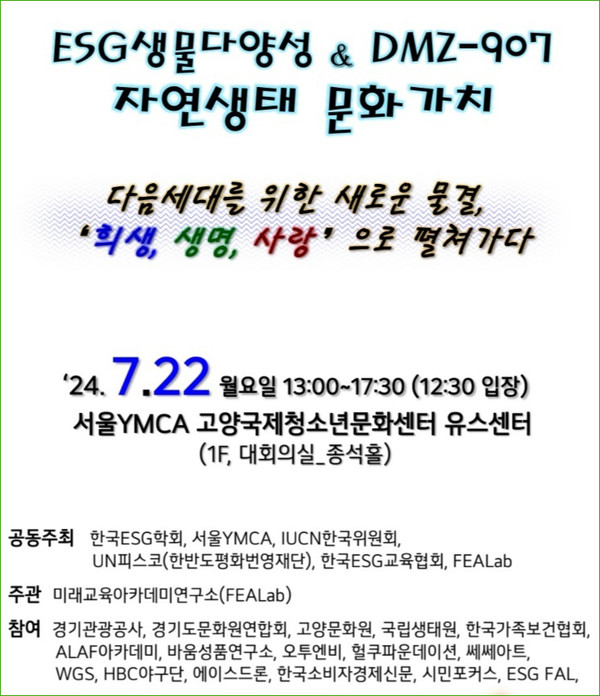 [고양신문] 'ESG 생물다양성과 DMZ-907 자연생태 문화가치'를 주제로 한 ESG사회공헌세미나가 오는 22일 오후 1시 일산동구 YMCA 국제청소년문화센터 종석홀에서 열린다. 이번 세미나는 서울YMCA와 한국ESG학회, IUCN한국위원회, UN피스코 등 다양한 기관과 단체의 공동 주최로 진행된다. 주관은 미래교육아카데미연구소(FEALab)가 맡으며, 경기관광공사와 오투엔비, WGS(위즈덤글로벌스쿨), HBC야구단, 한국가족보건협회, 에이렙아카데미 등이 후원한다.