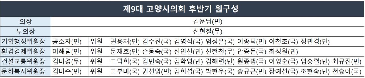 더불어민주당은 제9대 고양시의회 후반기 의장을 비롯해 4개 상임위 중 3개 위원장 자리를 차지했다. 반면 국민의힘은 제9대 고양시의회 후반기 원구성에서 완전히 소외된 셈이다.