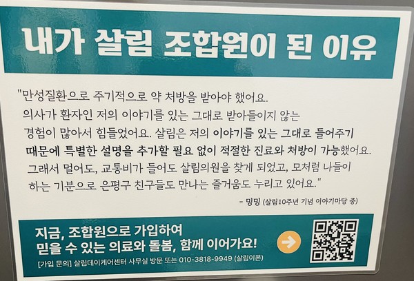 살림데이케어센터 화장실에 붙어있는 메모 ‘내가 살림 조합원이 된 이유’이다. 2012년 2월 348명의 조합원이 모여 가정의학과 ‘살림의원’과 살림의료사회적협동조합을 만들었다. 2016년 ‘살림치과’가 만들어지고, 2021년 9월 장기요양보험 제도에 따른 ‘방문요양’과 ‘주간보호센터’를 운영하는 ‘살림데이케어센터’가 문을 열었다. 2022년부터는 방문진료를 전담하는 ‘살림재택의료센터’를 설립해 돌봄 기능을 더욱 확대할 수 있었다. 치매 케어 노인들을 위한 서로돌봄카페도 조합원들의 힘으로 운영됐다. 여성주의, 소외된 이들을 우선하는 의료사회적협동조합과 지역협동조합, 활발한 마을네트워크 구축까지. 마을에서 진보적인 가치를 구현하며 지역의 확장까지 이뤄낸 은평구 살림의사협은 전국적으로 부러움을 사고 있다.