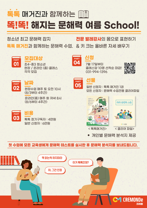 [고양신문] 사회적기업 크레몽은 초등4~중등3학년을 대상으로 '톡톡매거진과 함께 하는 똑!똑!해지는 문해력 여름스쿨' 참가자를 모집 중이다. 청소년 대상 문해력 잡지인 ‘톡톡 매거진’과 함께 하는 문해력 수업, 전문 발레강사의 몸으로 표현하기와 키 크는 자세 배우기 등의 프로그램이 4주간 진행된다.