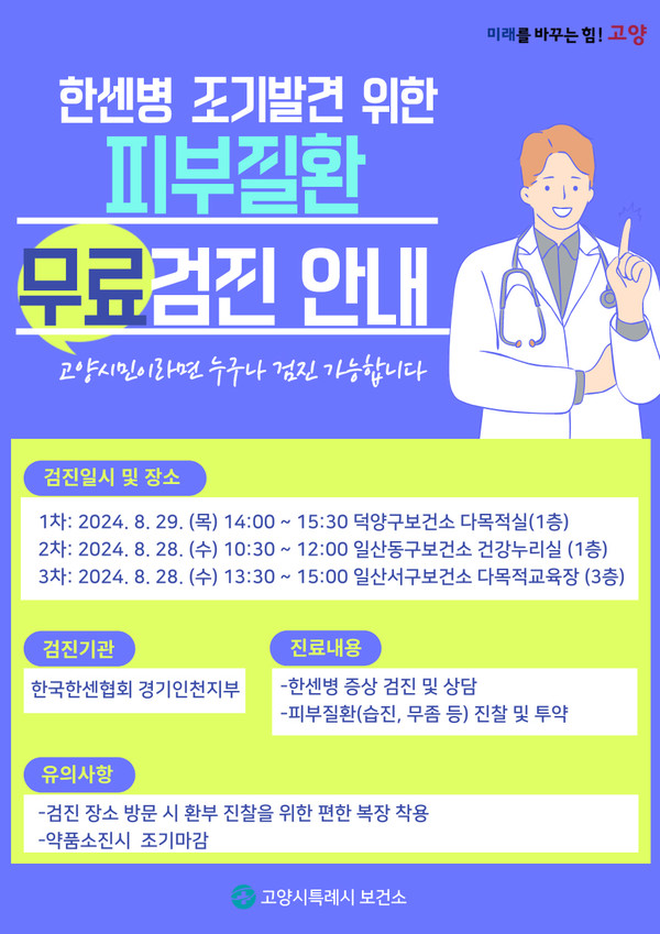 [고양신문] 고양시는 오는 8월 28일과 29일 양일간 총 3회에 걸쳐 3개 구(덕양구·일산동구·일산서구) 보건소에서 한센병 조기발견을 위한 피부질환 무료검진을 한다.