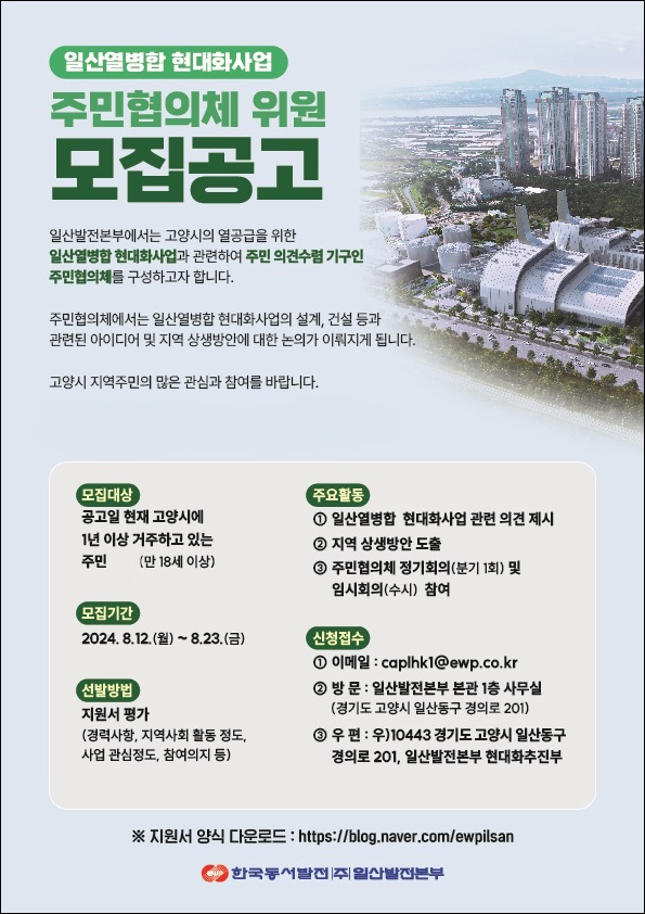 신청 접수는 이메일과 방문, 우편으로 가능하다. 이메일(caplhk1@ewp.co.kr) 또는 방문(고양시 일산동구 경의로 201, 일산발전본부 본관 1층 사무실) 접수하거나 우편(고양시 일산동구 경의로 201, 일산발전본부 현대화추진부) 접수하면 된다. 지원서 양식은 일산발전본부 공식 블로그(https://blog.naver.com/ewpilsan)에서 다운로드할 수 있다.