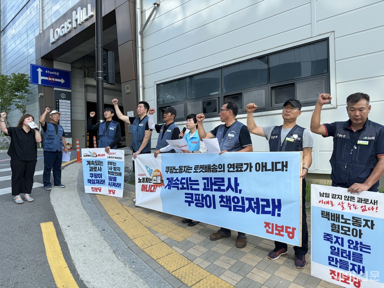 진보당 고양시지역위원회와 민주노총 고양파주지부는 14일 덕양구 오금동에 자리한 쿠팡5캠프 앞에서 택배없는 날 참여를 거부한 쿠팡을 규탄하는 기자회견을 진행했다. ‘택배없는 날’은 2020년 당시 고용노동부와 한국통합물류협회, 택배 4사가 택배 종사자들의 휴식보장을 위한 사회적 합의를 통해 지정한 날로 올해로 다섯 번째를 맞이하고 있다. 하지만 쿠팡 CLS는 아직까지 ‘택배없는 날’과 ‘과로방지 사회적 합의’에 동참하지 않고 있는 상황이다.