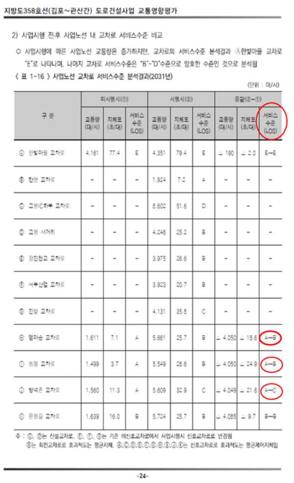 이날 토론자로 나선 김해련 시의원은 ‘지방도358호선(김포~관산간) 도로건설사업 교통영향 평가서(2031년 기준)’를 근거로 “도로 개통 후 고양시의 전체적인 교통서비스 수준은 오히려 낮아진다”며 “김포~관산간 도로건설 사업비 전액은 LH가 부담해야 한다”고 강조했다. 평가서에 따르면, ‘고양시 부분 구간’에 대해 사업시행 전·후 사업노선 서비스 수준을 분석한 결과 문봉길교차로~문봉사거리 서비스 수준이 ‘F’로 나타났다. 또한 대부분의 구간이 사업시행 후 서비스 수준이 한 단계씩 낮아지는 것으로 드러났다<아래 표 참고>. 김 시의원은 이런 결과에 대해 “도로가 신설되거나 편도 2차로인 곳들이 확장되더라도 운정신도시에서 유입된 차들이 그만큼 늘어나기 때문이다”라고 설명했다.