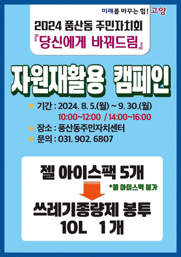 [고양신문] 일산동구 풍산동 주민자치회는 젤 아이스팩을 가져오면 쓰레기종량제 봉투로 교환해 주는 ‘당신에게 바꿔드림’ 사업을 추진한다고 20일 전했다.