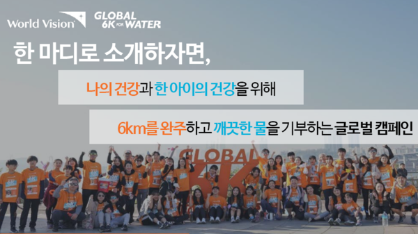 글로벌 6K를 한마디로 소개하면 ‘너와 나를 위한 달리기’다. 6㎞의 거리를 거뜬히 달리며 내 건강을 챙기고, 멀리 아프리카의 한 아이에게 깨끗한 물과 건강한 삶을 선물하는 행사이기 때문이다. 6㎞는 식수난으로 고통받는 아프리카 아이들이 물을 떠오기 위해 걷는 평균 거리를 의미한다.