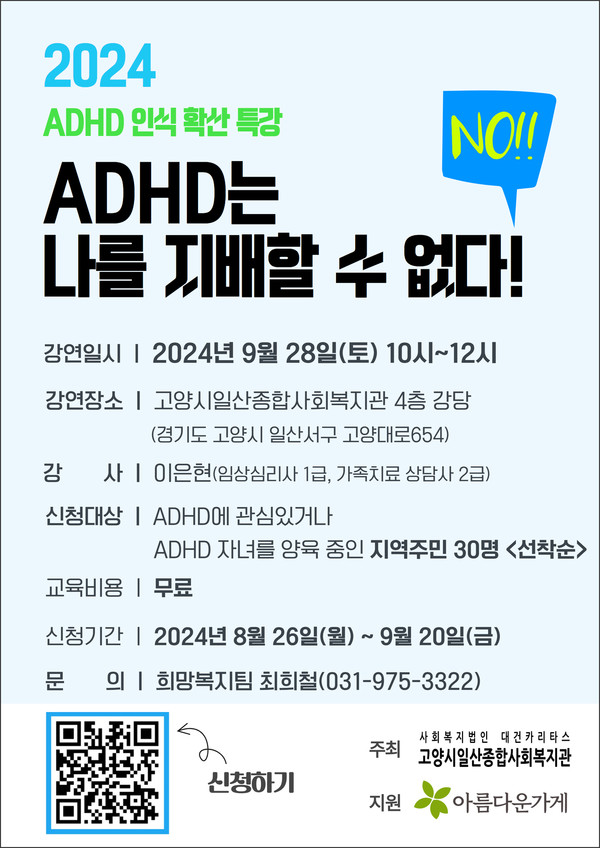 [고양신문] 고양시일산종합사회복지관(관장 최찬영)은 오는 9월 28일(토) 오전 10시~낮 12시 '2024년 ADHD 인식 확산 특강'을 복지관 4층에서 진행한다. 이은현 임상심리사이자 가족치료 상담사의 강의로 진행되며, 대상은 ADHD 아동을 양육 중이거나 관심있는 부모다.