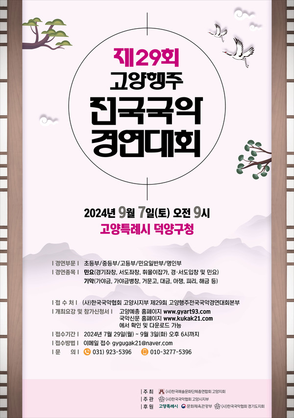[고양신문] 우수한 국악인 배출과 전통문화 발전을 위한 제29회 고양행주 전국국악 경연대회가 오는 9월 7일 오전 9시 덕양구청에서 열린다. 이번 대회는 초등부와 중등부, 고등부, 민요 일반부, 명인부로 나뉘어 다양한 연령대의 참가자들이 경연을 펼친다.