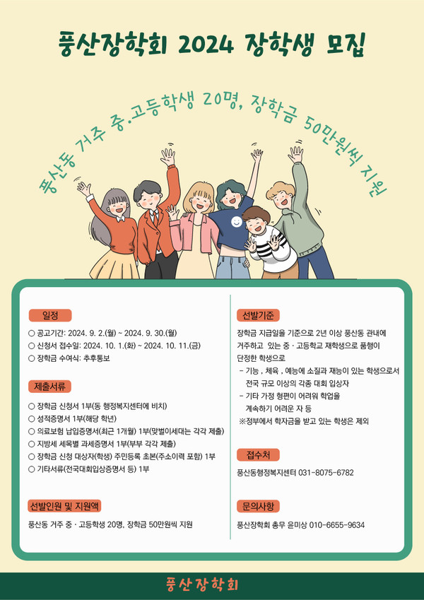 자세한 사항은 9월 2일(화)부터 9월 30일(월)까지 동 행정복지센터 앞 게시판 및 풍산동 아파트 관리사무소에서 부착된 공고문을 통해 확인할 수 있다. 접수 기간은 10월 1일(화)부터 10월 11일(금)까지이고, 신청서, 성적증명서, 주민등록 초본 등 제출서류를 구비해 풍산동 행정복지센터에 제출하면 된다.