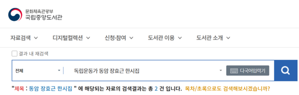 교보ebook과 함께 국립중앙도서관 홈페이지에서도 『독립운동가 동암 장효근 한시집』을 PDF 형태로 무료 다운받을 수 있다.