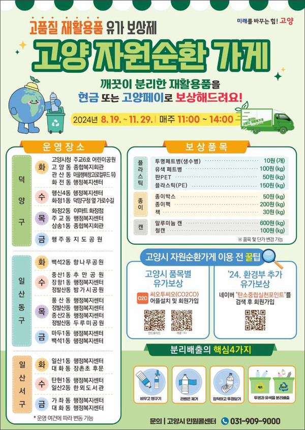 행주동 자원순환가게는 주민들의 자발적인 분리배출 참여를 촉진하고, 탄소중립을 향한 지역사회의 실질적인 변화를 이끄는 중요한 역할을 하고 있다. 기후위기 시대에 탄소중립을 위한 행동이 어느 때보다 중요해진 지금, 자원순환가게는 지속 가능한 미래를 향한 고양시의 의지를 보여주고 있다.