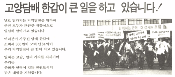공모전 표어와 표어와 함께 ‘고양담배 한 갑이 큰 일을 하고 있다’는 제목의 고양군 공공광고가 실리기도 했다. ‘담배 한 갑 소비세 360원이 모여 84억원의 세수가 확보된다. 고양담배 소비가 문화와 안락이 깃든 전원도시의 밝은 내일을 기약한다’는 거창하기 그지없는 내용이다. 이 표어를 통해 당시 고양군이 장차 거대도시로 성장할 고양의 미래를 어떤 모습으로 상상했는지를 짐작할 수 있다.
