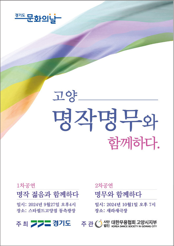 ‘2024 춤으로 세계로’의 마지막 프로그램은 (사) 대한무용협회 소속 고양시지부가 경기도 문화의 날 공모사업에 선정된 ‘고양 명작명무와 함께하다’이다. 9월 27일 오후 4시 스타필드 고양점에서 ‘명작 젊음과 함께하다’가 첫 번째 무대로 열리며, 10월 1일 오후 7시 새라새극장에서 ‘명무와 함께하다’로 2차 공연이 진행된다.