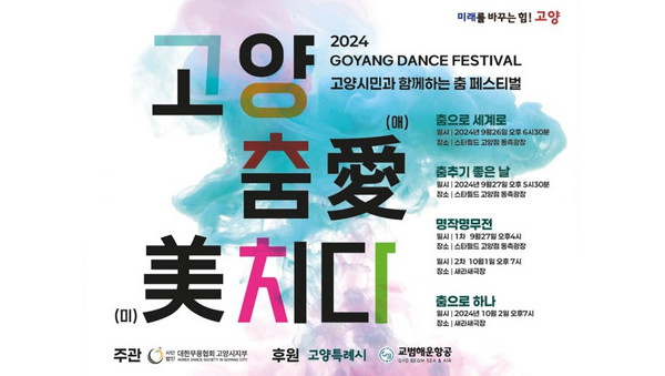[고양신문] 전 세계의 춤이 하나로 어우러지는 ‘2024 춤으로 세계로 (GOYANG! World Dance Festival)’가 고양시에서 열린다. 이번 축제는 (사)대한무용협회 소속 고양시지부가 경기관광공사 공모사업에 선정되어 기획한 것으로, 9월 26일 오후 6시30분 스타필드 고양점 동측 광장에서 첫 막을 올린다.