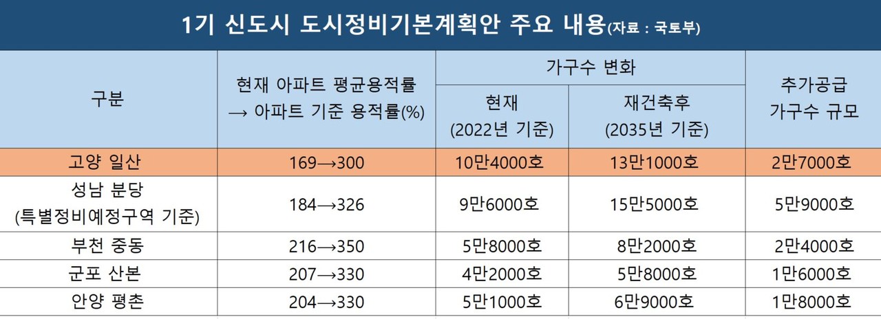 이러한 기준용적률을 적용한 재건축을 하게 되면, 현재 10만4000호(24만명) 규모인 일산신도시가 2035년까지 주택 2만7000호가 추가 공급되어 13만1000호 규모의 도시로 팽창한다. 구체적으로 보면 아파트 2만3090호(5만1337⟶7만4427호), 주상복합 1096호(3750⟶4846호), 연립주택 2845호(4965⟶7810호), 영구임대 137호(1141⟶1278호)가 추가 공급된다.