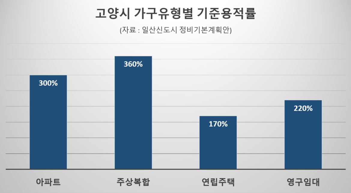 사실 5곳 1기신도시 중에 일산신도시의 기준용적률이 가장 낮다. 중동이 350%, 산본과 평촌이 330%, 분당이 326%인데 비해 일산신도시의 기준용적률은 300%에 머문다.