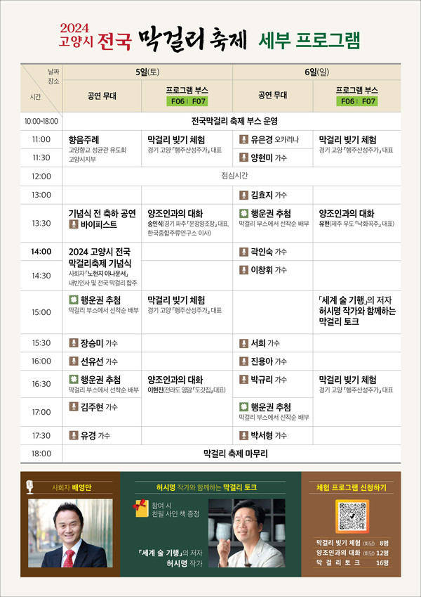 [고양신문] ‘2024 고양시 전국 막걸리축제’가 10월 5일과 6일에 걸쳐 일산문화광장에서 열린다. 올해부터는 고양시양조장협의회가 주최·주관 하고 고양시가 후원한다.