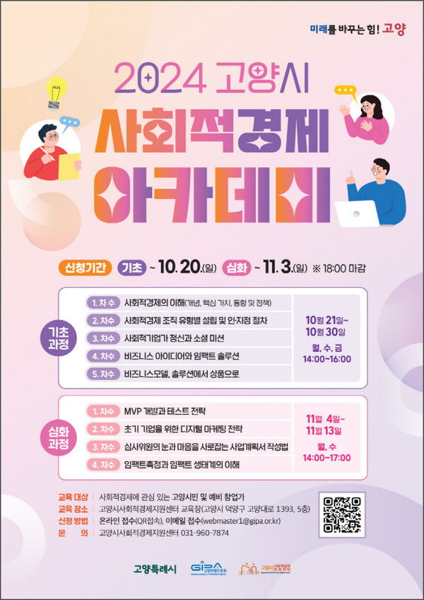 [고양신문] 고양산업진흥원(원장 한동균)이 운영하는 고양시사회적경제지원센터가 ‘2024년 하반기 고양시 사회적경제 아카데미 기초·심화 과정’ 수강생을 모집한다. 기초 과정은 10월 20일(일)까지, 심화 과정은 11월 3일(일)까지 신청 가능하다.
