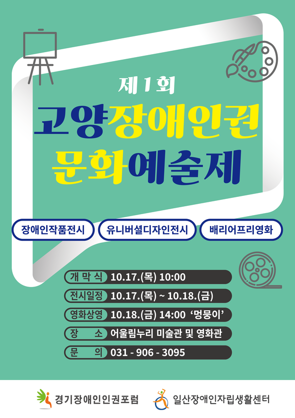예술제는 17일(목) 오전 10시 개막식을 시작으로 18일(금) 오후 2시 배리어프리 영화 상영을 끝으로 마무리되며, 영화관람 신청은 일산장애인자립생활센터(031-906-3095)로 문의하면 된다.