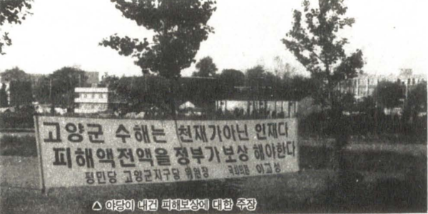 후자의 입장이었던 수재민들은 9월 말 ‘고양군수재민대책위원회(위원장 황한익)’를 구성하고 공동대응에 나섰다. 이들은 △일산제방 붕괴에 대한 진상 규명 △국가배상법에 기준한 주택가축 완전한 배상 △토사에 묻히고 오염된 농토에 대한 장기적 배상 △항구적 수해대책 수립 등을 요구했다. 수재민들은 ‘하늘의 뜻 아니었다, 농민들은 분노한다’라는 구호가 적힌 현수막을 내걸려 했지만, 공무원들은 현수막 게시를 가로막으며 수재민들의 결집을 가로막았다.