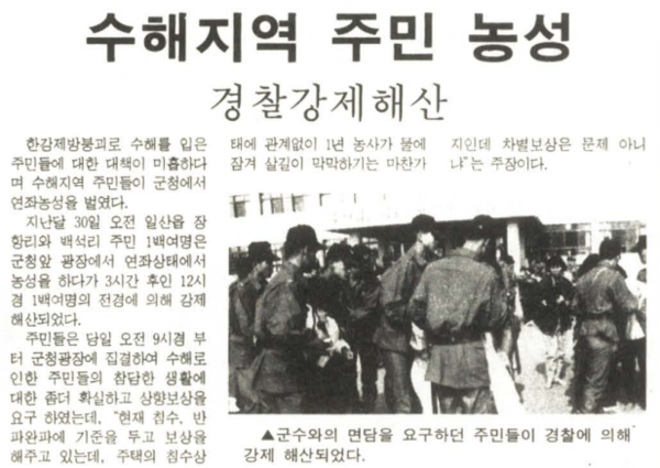 결국 수재민들은 대책위를 중심으로 점점 저항의 강도를 높여갔다. 11월에는 군청으로 몰려와 ‘등급별 차별보상 아닌 일괄보상’을 주장하며 연좌농성을 펼쳤고, 연말에는 150여 명의 수재민들이 여의도 국회의사당 앞 차가운 콘크리트 바닥에서 △제방관리 부실 홍수조절 실패 △피해 키운 수중보건설 △무분별한 토사 채취 △긴급보수공사 요구 묵살 등 정부의 책임을 조목조목 지적하며 구호를 외치기도 했다.