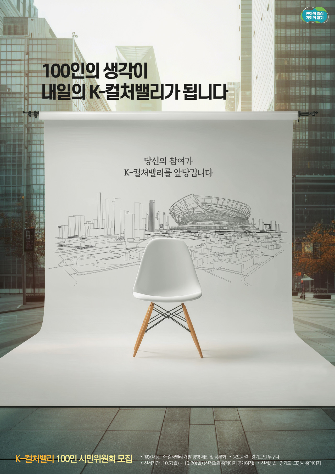 경기도는 ‘K-컬처밸리 100인 시민위원회’는 연령 인구비율을 고려해 연령대별로 무작위 추첨으로 선정해 10월 24일 개인에게 통보할 계획이다.
