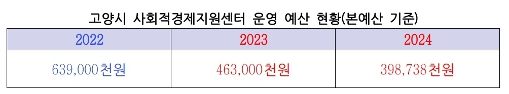 이처럼 최근 몇 년간 고양시 사회적경제기업 지원 사업이 축소된 이유는 예산 삭감 때문이다. 신 의원에 따르면 고양시 사회적경제 지원사업을 총괄하는 사회적경제지원센터의 운영 예산은 2022년 6억3900만원에서 올해 4억원으로 40%가까이 줄었다.
