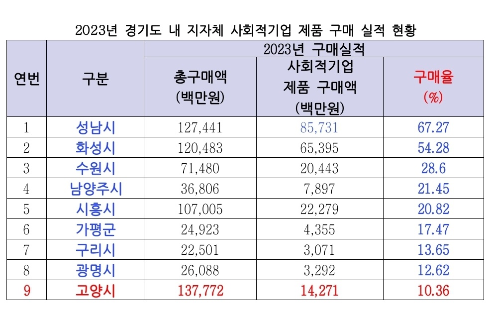 이뿐만이 아니다. 올해 4월 고용노동부가 공고한 2023년 사회적기업 제품 구매실적 비율에 따르면 고양시는 10.36%로 경기도 31개 시군 중 9위를 보였다. 이는 성남시 67%, 화성시 54%와 비교해 턱없이 낮은 수치로, 2017년 11월 제정된 ‘고양시 사회적경제 기업 제품구매 촉진 조례’가 시 정책에 제대로 반영되지 않고 있음을 보여주는 결과라고 할 수 있다. 반면 광명시의 경우 매년 사회적경제기업 구매비중을 늘려 작년 기준 목표금액(50억원)을 초과한 74억원의 실적을 냈으며 이를 통해 작년 말 지방자치단체 사회적경제 정책평가에서 최우수상을 받는 등 고양시와 비교되는 행보를 보이고 있다.