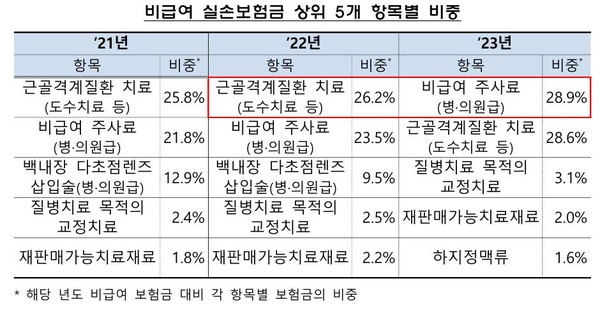 금감원 ‘2023년 실손의료보험 사업실적’에 의하면 전체 실손보험 지급보험금 중 ‘의원’의 비중(32.9%)이 가장 크기는 하나, 백내장 수술 감소 등으로 전년 대비 하락했고, 2022년 백내장 대법원 판결 등으로 인해 다소 감소했던 비급여 지급보험금이 다시 증가세로 전환했다. 또한 무릎줄기 세포주사 등 신규 비급여 항목이 계속 출현하는 등 전체 실손보험금 중 비급여가 여전히 높은 비중 차지하고 있다.