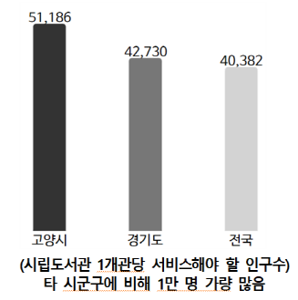 이러한 서비스 간극을 줄여주는 것이 바로 공립작은도서관의 역할이다. 시는 공립작은도서관 인프라나 규모가 타 지자체에 뒤처지지 않는다고 했으나, 2023년 경기도 작은도서관 현황을 보면 부천시 19개소, 성남시 26개소, 안양시 16개소, 안산시 12개소, 의정부 13개소 등으로 경기도 타 시군 인구 대비 많다고 볼 수 없다. 공립작은도서관 예산을 역시, 2023년 작은도서관 통계 기준 평균 고양시 5100만원, 부천시 6822만5000원, 안산시 7136만원, 안성시 8245만3000원, 파주시 7184만4000원, 1억원이 넘어가는 양주, 여주, 오산, 의왕에 비해 결코 많다고 볼 수 없다.