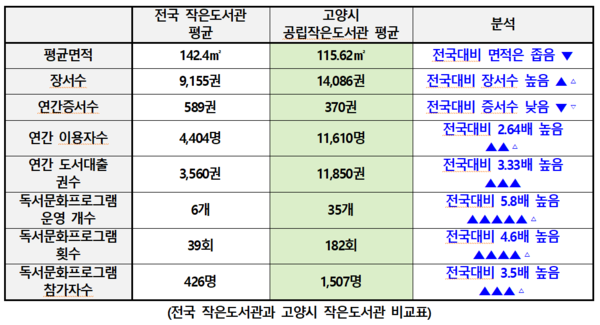 전국 공립작은도서관에 비해 평균 면적은 작고, 연간 증서수도 낮게 조사됐지만, 연간 이용자 수는 전국 대비 2.64배 높으며 연간 도서 대출 권수도 3.33배 높은 수준이고, 독서문화프로그램 수와 실시 횟수, 참가자 수 역시 전국 평균 3~6배 높은 수준이다.(제 3차 고양시 중장기 발전 계획 작은도서관 운영 현황 인용) 이는 그간 고양시가 공립작은도서관에 사서 1인을 배치하고, 전문성을 가진 민간과 적절히 협력하는 노력을 해온 결과이다.
