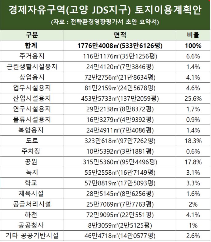 환경적 문제 외에 전략환경영향평가서에 담긴 고양JDS지구의 토지이용계획도 관심을 끌었다. 고양JDS지구는 총 17.66㎢(534만평)로, 이는 일산신도시 규모(15.7㎢)를 능가하는 규모다. 이곳을 경제자유구역 지정을 통해 산업, 주거, 상업, 문화·환경 등을 반영한 복합도시로 개발하겠다는 계획이다.