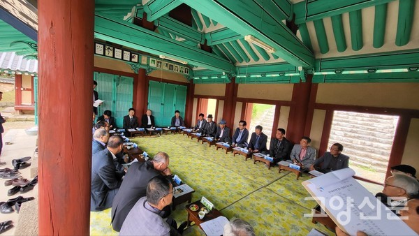 고양향교(전교 강홍강)는 북경기향교발전협의회(회장 이상원 양주향교 전교) 정례모임을 지난 15일 가졌다. 이날 행사에는 고양향교를 비롯해 가평·김포·통진·파주·교하·적성·포천·양주향교 총 10곳 향교의 전교와 유도회장, 사무국장 등 30여 명이 참석했다. 북경기향교발전협의회는 대성전에 올라 봉심을 한 후 북경기 지역 향교 발전에 대한 현안을 논의하고, 고양향교 옆 중남미문화원을 견학했다.