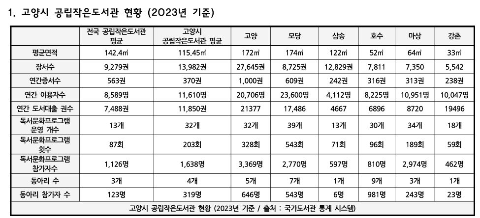 다른 통계지표를 살펴보면 고양시 공립 작은도서관이 얼마나 활성화 되고 있는지를 좀 더 명확히 확인할 수 있다. 독서문화프로그램 운영 개수의 경우 고양시는 전국 평균에 비해 2배 이상 많았고(전국 13개, 고양시 32개) 참가자 수 또한 전국 평균 대비 약 500명이 많았다. 특히 동아리 참가자 수는 전국 123명, 고양시 319명으로 3배 가까이 차이가 나는 것으로 확인돼 이용률이 낮아서 폐관 결정을 내렸다는 시의 주장은 사실과 다른 것으로 나타났다.