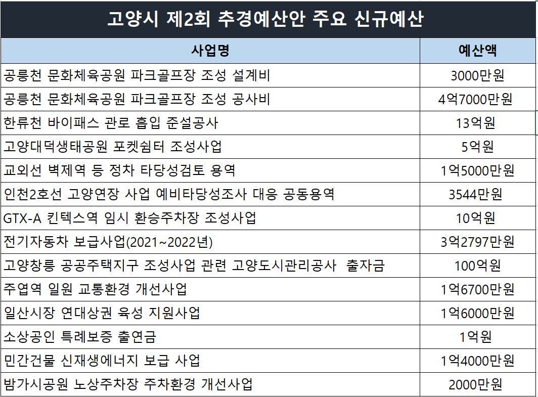 이 외 △창릉 공공주택지구 조성사업을 위한 고양도시관리공사 출자금 100억원 △일산시장 연대상권 육성 지원사업 1억6000만원 △소상공인 특례보증 출연금 1억원 △민간건물 신재생에너지 보급 사업 1억4000만원 △주엽역 일원 교통환경 개선사업 1억6700만원 등이 확정됐다.