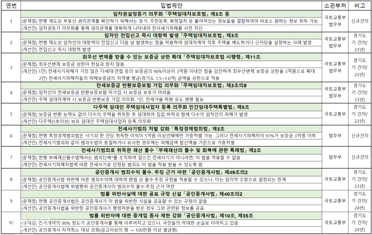 [고양신문] 경기도는 지난 23일 ‘전세피해 예방 및 전세사기범죄 처벌 강화’를 위한 제도개선안을 마련하고 중앙정부에 건의했다. 이번 제도개선을 위한 안건은 총 10건이다. 큰 틀에서 ‘주택임대차보호법’, ‘특정경제범죄가중처벌 등에 관한 법률’, ‘공인중개사법’ 개정이다.