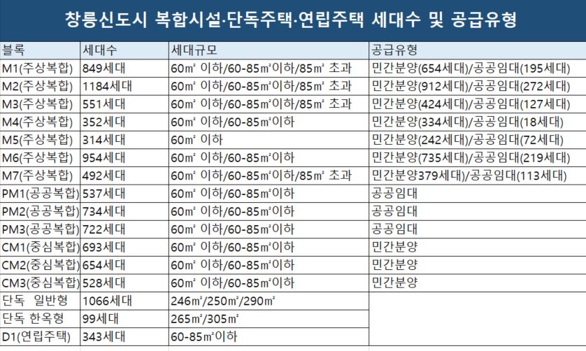 창릉신도시의 총면적은 789만㎡(239만평)다. 이중에서 주택건설용지는 191만3174㎡(58만평)으로 총면적의 24.3%에 해당한다. 주택건설용지는 아파트 32개 블록, 복합시설 13개 블록, 단독주택 5개 블록, 연립주택 1개 블록 등 총 51개 블록으로 구성됐다. 현재 창릉신도시 51개 블록 중 3개 블록에서만 아파트 건설공사 시공업체가 정해졌다.