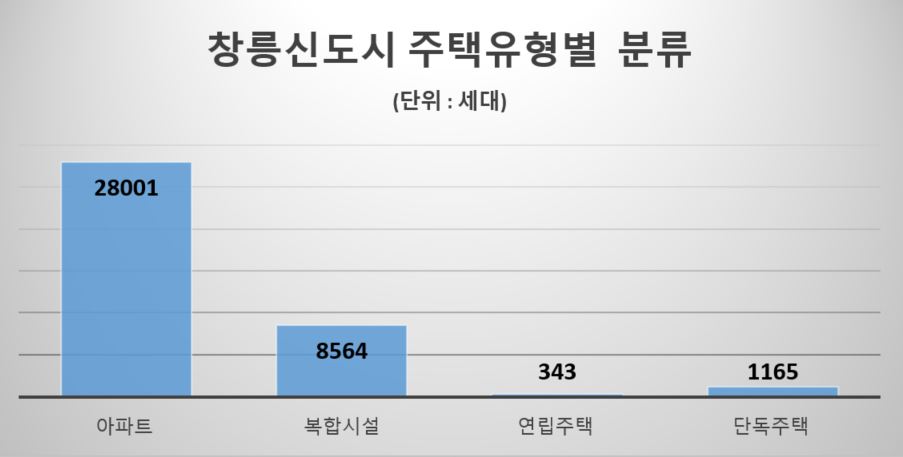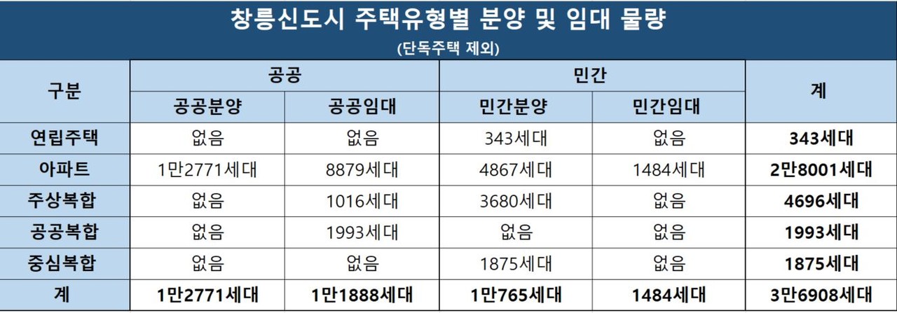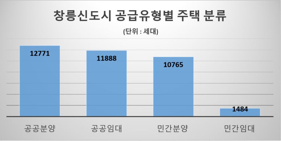 단독주택(1165세대)을 제외한 공동주택(3만6908세대)을 공급유형별로 분류하면 공공분양 1만2771세대(34.6%), 공공임대 1만1888세대(32.2%), 민간분양 1만765세대(29.2%), 민간임대 1484세대(4%)로 구성됐다. 분양 아파트는 2만3536세대(63.8%), 임대 아파트는 1만3372세대(36.2%)로 나뉜다.