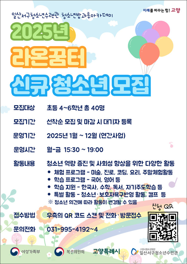 [고양신문] 고양시청소년재단(대표이사 최회재) 일산서구청소년수련관 방과후아카데미가 2025년도 신입생 모집을 위해 입학 상담을 시작한다.