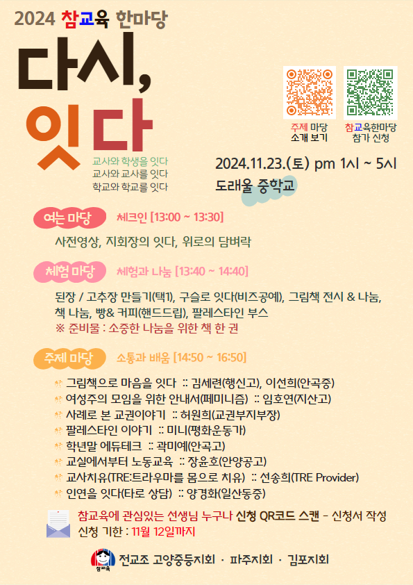‘그림책으로 마음을 잇다’(김세련/해인고, 이선희/안곡중), ‘여성주의 모임을 위한 안내서’(임호연/지산고), ‘사례로 본 교권이야기’(허원희/교권부지부장), ‘팔레스타인 이야기’(미니/평화운동가), ‘학년말 에듀테크’(곽미예/안곡고), ‘교실에서부터 노동교육’(장윤호/안양공고), ‘교사치유(TRE 트라우마를 몸으로 치유)’(선송희), ‘인연을 잇다’(양경화/일산동중) 등의 소통과 배움 행사가 진행될 예정이다.