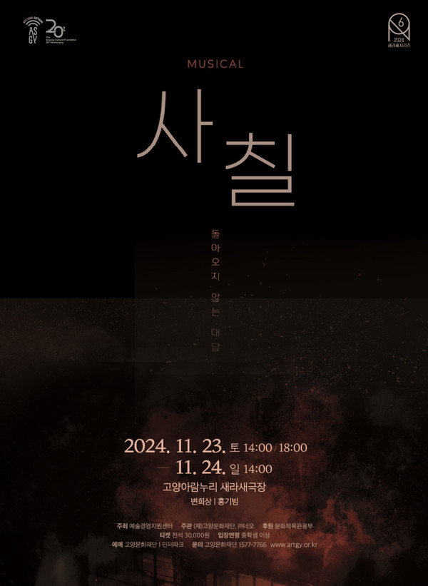 [고양신문] 위험의 최전선에 서야만 하는 소방관들의 사명과 애환을 유쾌한 감동으로 그려낸 창작뮤지컬 <사칠>이 오는 23일과 24일 고양아람누리 새라새극장 무대에 오른다.
