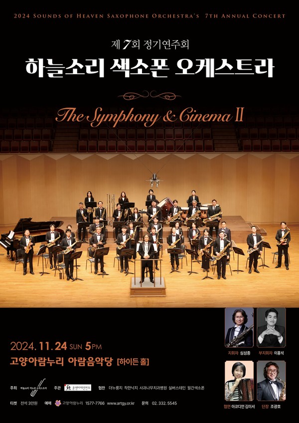 [고양신문] ‘하늘소리 색소폰 오케스트라(단장 조광호, 이하 하늘소리)’가 11월 24일 고양아람누리 아람음악당 하이든홀에서 제7회 정기연주회 <심포니 & 시네마>를 개최한다. 1부에서는 ‘마술피리 서곡’, ‘페르귄트 모음곡’ 등의 교향곡을, 2부에서는 ‘써니’, ‘타이나닉’ 등의 영화음악을 들려준다.