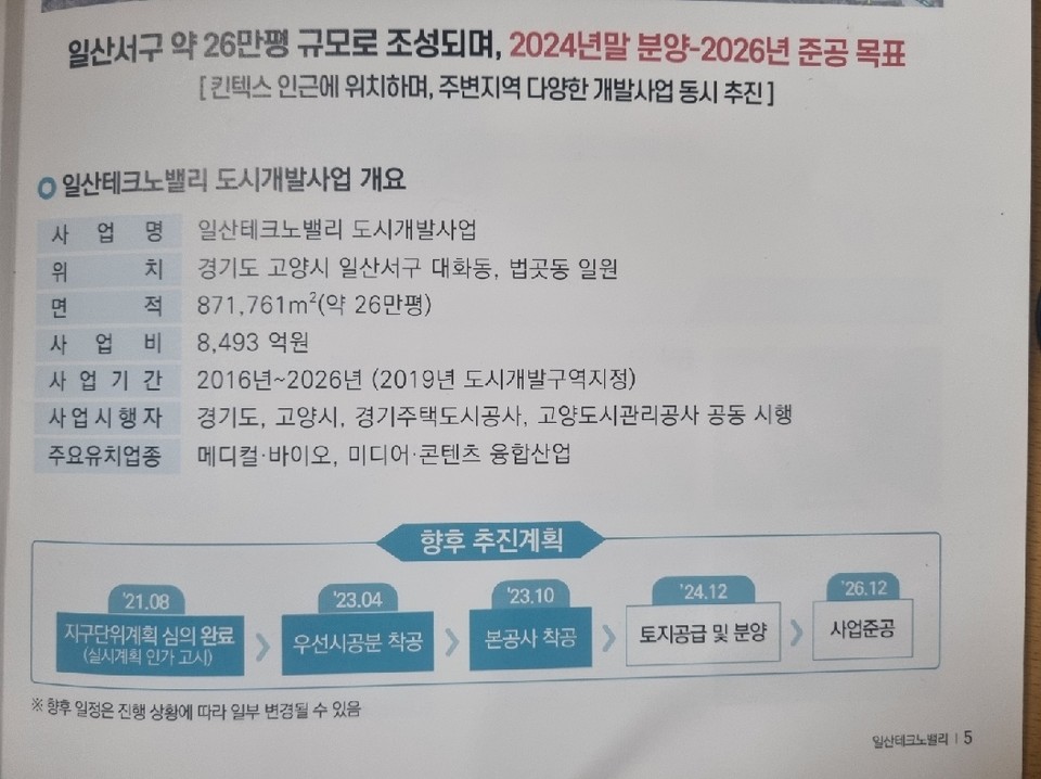 일산테크노밸리는 GH, 고양시, 경기도, 고양도시관리공사 총 4개 공동시행이다. 사업비용은 총 8493억원으로 사업지분은 GH가 65%, 고양시 35%로 이들의 추진력이 특히 중요하다. 공동으로 계획된 일산테크노밸리는 일산서구 대화·법곳동 일원에 해당한 용지 85만385㎡(26만평)에 대해 작년 10월 본공사를 시작으로 올 하반기 분양에 이어 2026년 12월 기업들이 준공한다는 것이 당초 계획이었다. 하지만 기업유치가 핵심인 일산테크노밸리 사업에 기업 분양시기가 3자 간의 조율과 행정절차 등에 의해 사실상 내년으로 지연된 것이다.