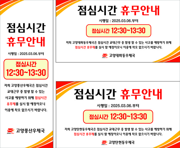 [고양신문] 고양일산우체국(국장 박세란)은 소속국인 고양대화동·고양탄현동·고양풍산동우체국이 2025년 3월 6일부터 3개월간 점심시간 휴무제를 시범 운영한다고 전했다.